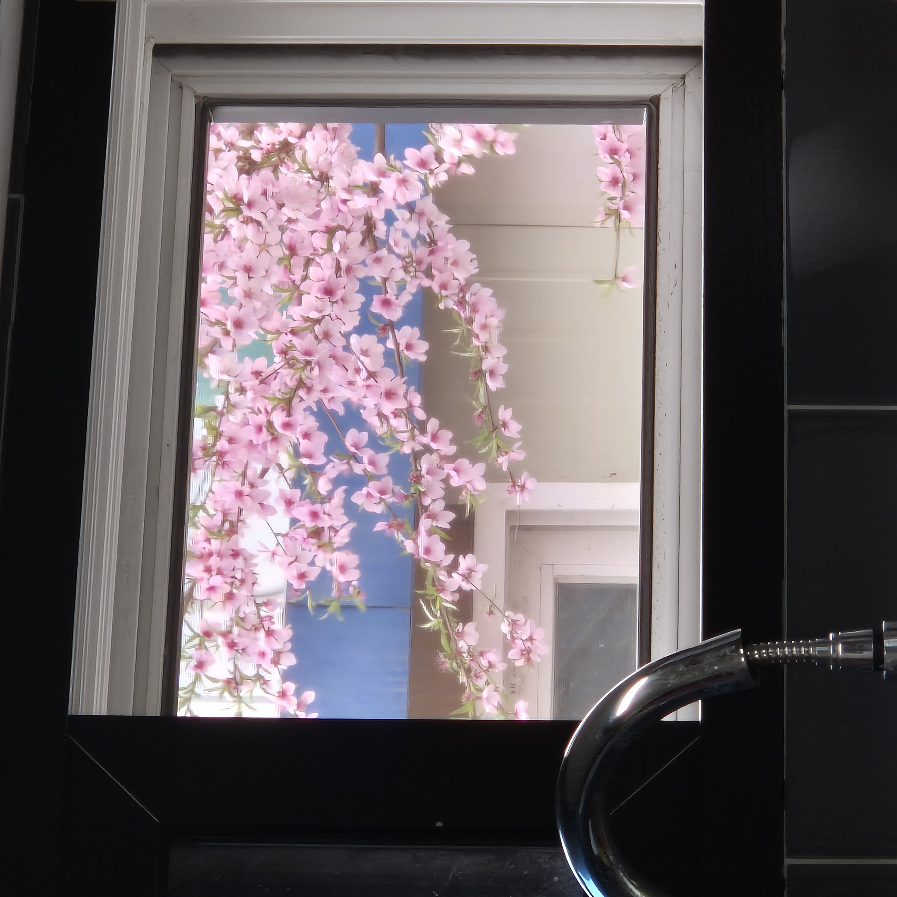 어머님집 수전 뒤 창문 넘어 보이는 복숭아꽃이 너무 예쁘다.